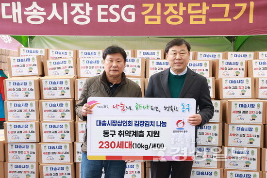 ▲ 울산 동구 대송시장 상인회(회장 이윤형)는 25일 대송시장 일원에서 상인들과 자원봉사자 등 30여명이 참여한 가운데 1000만원 상당의 김치를 담가 관내 취약계층 230가구에 전달했다.울산 동구 대송시장 상인회(회장 이윤형)는 25일 대송시장 일원에서 상인들과 자원봉사자 등 30여명이 참여한 가운데 1000만원 상당의 김치를 담가 관내 취약계층 230가구에 전달했다. 저작권자 © 울산일보 무단전재 및 재배포 금지 주하연 기자 다른기사 보기 페이스북 트위터 카카오스토리 URL복사 기사공유하기