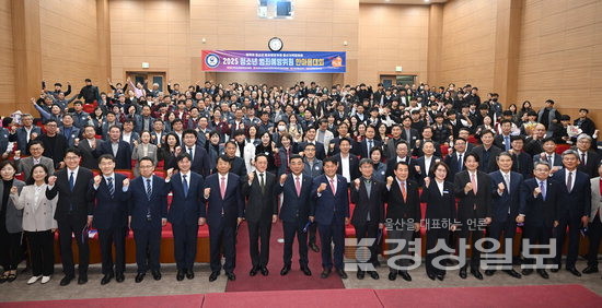 법무부 청소년 범죄예방위원 울산지역협의회(회장 이윤철)는 25일 울산지방검찰청 대강당에서 2025 청소년 범죄예방 한마음대회를 개최했다. 유도윤 울산지방검찰청 검사장과 김두겸 울산시장, 이성룡 울산시의회 의장, 천창수 울산시교육감, 나동연 양산시장, 최은지 양산교육지원청 교육장 등 참석자들이 기념촬영하고 있다. 김동수기자 dskim@ksilbo.co.kr