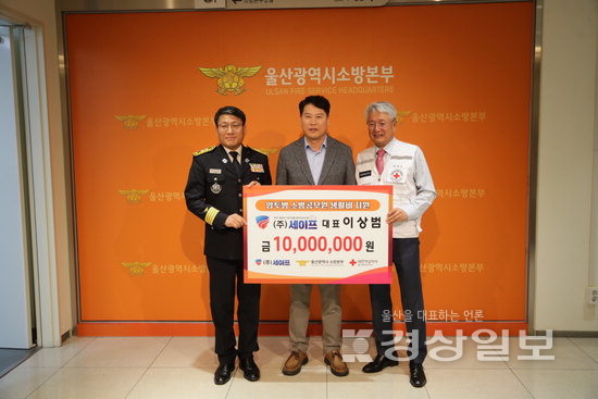 기부금 전달식은 이날 울산소방본부장실에서 열렸다. 전달식에는 홍장표 울산소방본부장과 이상범 세이프 대표, 채종성 대한적십자사 울산지사 회장 등이 참석했다.