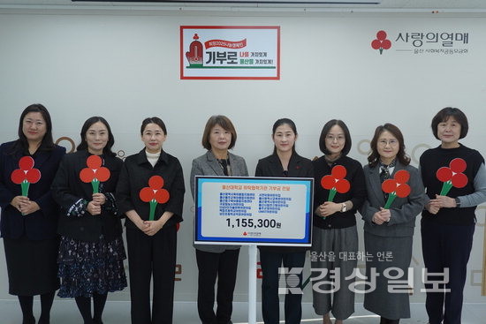 ▲ 울산대학교에서 위탁 및 협력 운영하고 있는 13개 기관이 26일 울산사회복지공동모금회(회장 전영도)를 방문해 위탁협력기관 교직원들과 함께 온라인 플리마켓을 통해 모금한 이웃돕기 후원금 115만3300원을 전달했다.울산대학교에서 위탁 및 협력 운영하고 있는 13개 기관이 26일 울산사회복지공동모금회(회장 전영도)를 방문해 위탁협력기관 교직원들과 함께 온라인 플리마켓을 통해 모금한 이웃돕기 후원금 115만3300원을 전달했다.