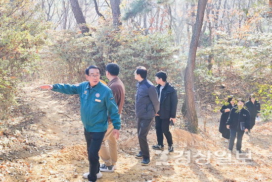 ▲ 울산시의회 안수일 의원은 1일 울산 남구 신정동 산 107-16(남산근린공원)를 찾아 산지일시사용신고(지반조사)로 인한 산림훼손과 시민 불편 사항을 점검(사진)했다.울산시의회 안수일 의원은 1일 울산 남구 신정동 산 107-16(남산근린공원)를 찾아 산지일시사용신고(지반조사)로 인한 산림훼손과 시민 불편 사항을 점검(사진)했다. 해당 부지는 연립주택 설계용역을 위한 지반조사를 목적으로 최근 울산 남구청으로부터 산지일시사용 신고를 했다. 하지만 남산 등산로 구간에 중장비가 투입되면서 산림이 훼손되고 있고, 운동과 여가를 즐기는 시민들에게 안전상 문제와 불편을 초래하고 있다. 안 의원은 “산림 훼손 최소화와 개발 제한 방법에 대한 검토를 요청한다”고 강조했다. 전상헌기자 저작권자 © 울산일보 무단전재 및 재배포 금지 전상헌 기자 다른기사 보기 페이스북 트위터 카카오스토리 URL복사 기사공유하기
