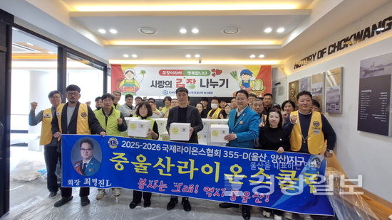 ▲ 울산남구지역자활센터(센터장 서경은)는 3일 조광선박 사옥에서 조광선박 봉사클럽(회장 김경하), 중울산라이온스클럽(회장 최병진)과 함께 사랑의 김장 나누기 봉사활동을 진행했다.울산남구지역자활센터(센터장 서경은)는 3일 조광선박 사옥에서 조광선박 봉사클럽(회장 김경하), 중울산라이온스클럽(회장 최병진)과 함께 사랑의 김장 나누기 봉사활동을 진행했다. 저작권자 © 울산일보 무단전재 및 재배포 금지 권지혜 기자 다른기사 보기 페이스북 트위터 카카오스토리 URL복사 기사공유하기