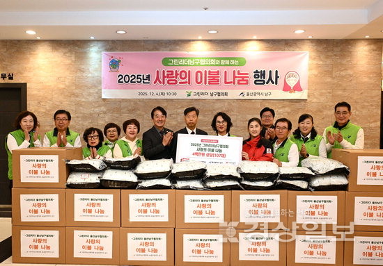 그린리더 울산남구협의회(회장 전정표)는 4일 문수컨벤션에서 회원 180여명이 참석한 가운데 제7회 그린스타트 실천 결의대회를 개최했다. 이날 재활용품 교환사업으로 발생한 수익금으로 저소득층 107가구에게 400만원 상당의 따뜻한 겨울을 보낼 수 있는 겨울 이불 전달 행사를 열었다.
