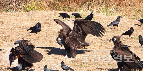 겨울철새인 독수리가 올해도 어김없이 몽골에서 울산을 찾아 겨울을 나고 있다. 4일 남구 삼호섬 인근에서 독수리들이 먹이활동을 하고 있다. 녹색에너지촉진시민포럼은 내년 1월3일부터 멸종위기 2급 독수리의 생태를 학습하는 독수리학교를 개최할 예정이다. 김동수기자 dskim@ksilbo.co.kr