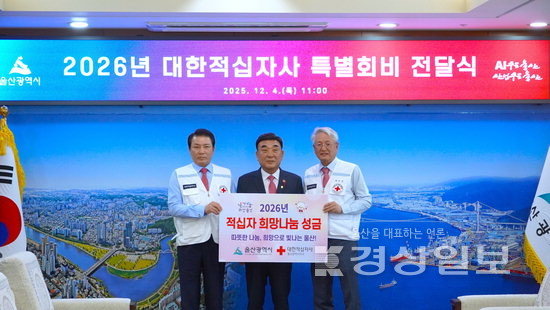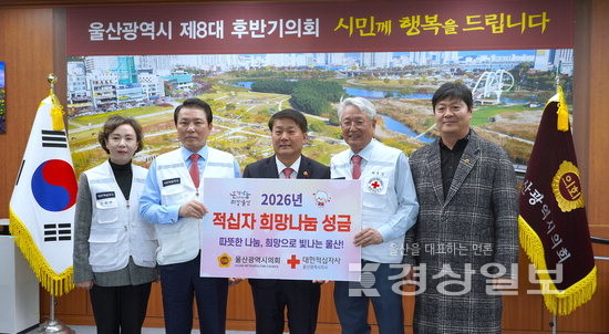 대한적십자사 울산시지사가 2026년 인도주의 사업을 통해 울산 시민에 사랑과 희망을 전달하기 위해 이뤄진 이번 성금 전달식에는 김두겸 울산시장, 이성룡 울산시의회 의장, 채종성 울산적십자사 회장, 정석관 부회장과 관계자가 참석했다.