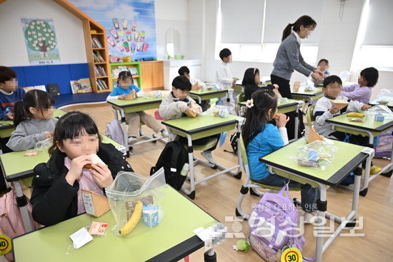 이에 따라 울산 전체 261개 학교 중 94곳(36%)에서 급식이 중단됐다. 78곳은 빵·우유 등 대체식으로, 10곳은 개인도시락으로 급식을 대체했다. 나머지 6곳은 단축수업했다. 다운초 학생들은 급식소에서 대체식을 받은 뒤 교실에서 끼니를 해결하기도 했다.