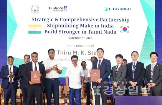 HD현대는 최근 인도 남부 타밀나두 주 마두라이에서 스탈린 주 총리와 라자 주 산업부 장관, 최한내 HD한국조선해양 기획부문장이 참석한 가운데 ‘신규 조선소 건설에 관한 배타적 업무협약’을 체결했다고 8일 밝혔다.