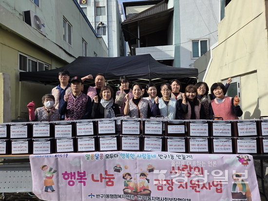 ▲ 울산 중구 반구1동 지역사회보장협의체(위원장 서혜진)는 8일 반구1동 행정복지센터를 방문해 지역 내 저소득층을 위해 직접 담근 150만원 상당의 김치 7㎏ 40상자를 전달했다.울산 중구 반구1동 지역사회보장협의체(위원장 서혜진)는 8일 반구1동 행정복지센터를 방문해 지역 내 저소득층을 위해 직접 담근 150만원 상당의 김치 7㎏ 40상자를 전달했다. 저작권자 © 울산일보 무단전재 및 재배포 금지 주하연 기자 다른기사 보기 페이스북 트위터 카카오스토리 URL복사 기사공유하기