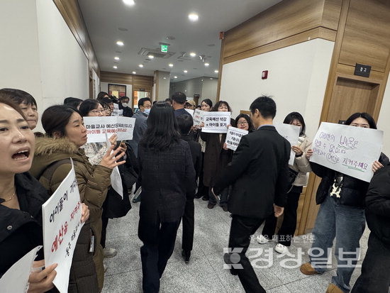 마을교사 사업 예산 삭감도 논란이 됐다. 이날 마을교사 20여명은 동구의회 복도에서 피켓을 들고 ‘아이들 교육권을 지켜달라’ ‘마을교사는 교육예산’ 등을 외치며 항의했다.