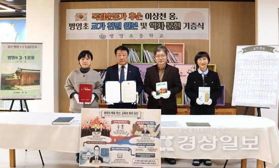 울산 중구 병영초등학교 46회 졸업생이자 독립운동가 후손인 이상천씨가 10일 병영초에 귀중한 사료를 기증했다. 전달된 사료는 이씨의 부친이자 병영초 교장을 지낸 고 이재우 교장이 직접 작곡한 교가의 친필 원본, 병영 3·1 운동사와 지역 애국지사의 약력을 집대성한 역사서 3권(1993년, 1997년, 2007년 발행본)이다.