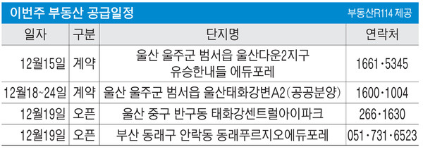 14일 부동산R114에 따르면 12월 셋째주 전국에는 총 7개 단지에서 2594가구(일반분양 1972가구)의 아파트가 분양에 들어간다. 이번주 울산에서는 울주군 범서읍 다운2지구 유승한내들 에듀포레와 울주군 범서읍 울산태화강변A2 공공분양 계약이 진행된다. 또 중구 반구동 태화강 센트럴아이파크가 견본주택을 연다.