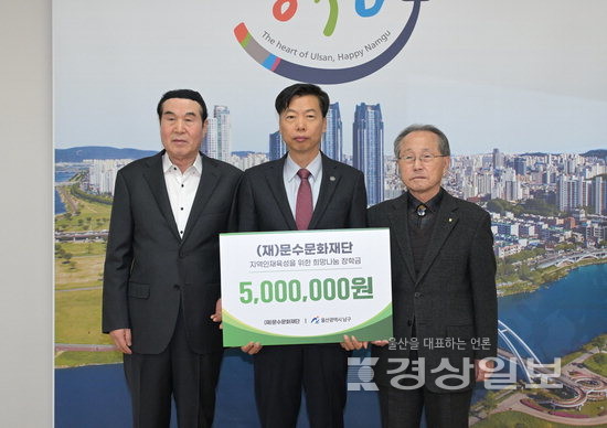 ▲ 재단법인 문수문화재단(이사장 배종환)은 15일 지역 인재 발굴과 교육 지원을 위한 장학금 500만원을 울산 남구청에 전달했다. 지원 대상은 △울산화력발전소 붕괴 사고 유가족 학생 가정 △생계곤란 가정의 학업성적 우수 학생 등 3가구다.재단법인 문수문화재단(이사장 배종환)은 15일 지역 인재 발굴과 교육 지원을 위한 장학금 500만원을 울산 남구청에 전달했다. 지원 대상은 △울산화력발전소 붕괴 사고 유가족 학생 가정 △생계곤란 가정의 학업성적 우수 학생 등 3가구다.