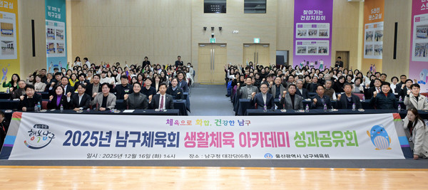 울산 남구체육회(회장 안춘태)는 16일 남구청 대강당에서 체육회 임원, 이사, 수강생 등이 참석한 가운데 2025년 생활체육 아카데미 성과공유회를 열고 시상식, 우수사례 발표, 프로그램발표회, 특별강연을 가졌다. 김경우기자 woo@ksilbo.co.kr
