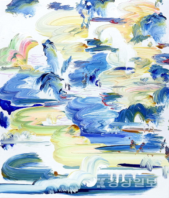 김산은 ‘백록(白鹿)’ 연작을 통해 한라산에 살았던 신성한 흰 사슴을 표현한다. 제주의 장수와 평화를 상징하는 백록을 사실적 묘사와 대기 원근법으로 담아내며 자연과 인간의 공존을 모색한다. 전희경은 산, 바위, 물, 파도, 안개 등 항상 같은 형상을 지니지 않는 대상들의 내재적 원칙을 탐구한다. 구체적 묘사나 원근을 배제하고 붓질의 속도와 물감의 물성, 터치의 레이어로 지시성 없는 열린 풍경을 제시한다.