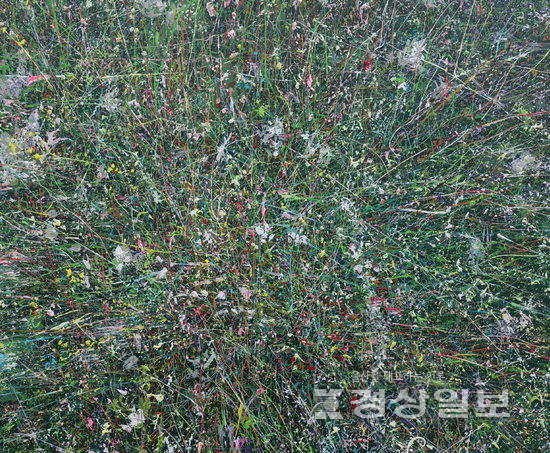 주한경은 들풀과 잡초, 개울가 식물들을 주요 소재로 삼는다. 여러 갈래로 갈라진 붓을 직접 제작해 던지고 흘리고 긋는 제스처를 통해 회화를 전개하며, 대상의 재현이 아닌 마주한 순간의 감각을 포착하는 회화적 사건이자 생성의 과정을 보여준다.