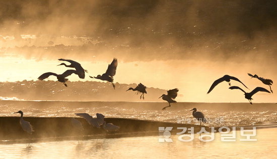 일교차가 큰 날씨가 이어지고 있는 가운데 17일 울산 태화강에 물안개가 피어오르는 환상적인 분위기가 연출되고 있다. 울주군 범서읍 망성교 아래에서 백로떼가 아침햇살 속에서 먹이활동을 하고 잇다. 김동수기자 dskim@ksilbo.co.kr