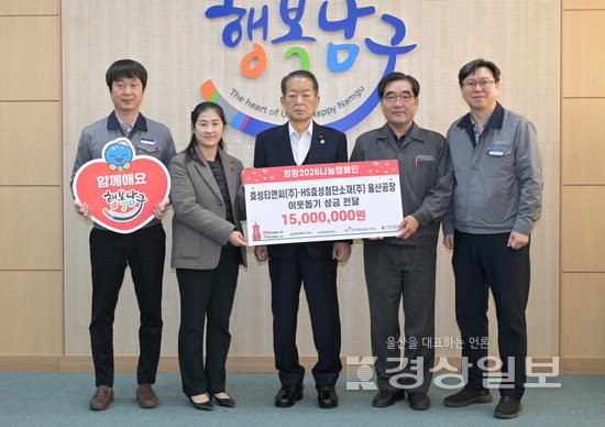 최학철 효성티앤씨, HS효성첨단소재 울산공장 상무는 18일 남구청을 방문해 이웃돕기 후원금 1500만원을 울산사회복지공동모금회에 지정 기탁했다. 최학철 상무는 “직원들이 어려운 이웃을 돕겠다는 마음으로 기부했다”며 “직원들과 나눔활동에 적극 동참해 이웃의 행복과 함께 성장하는 기업이 되겠다”고 말했다.
