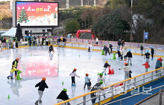 울산 문수 꿀잼 빙상장이 22일 문수체육공원 호반광장에서 개장식을 갖고 내년 2월8일까지 운영에 들어갔다. 개장 첫날 빙상장을 찾은 시민들과 어린이들이 스케이트를 타며 겨울 분위기를 만끽하고 있다. 김도현기자 do@ksilbo.co.kr
