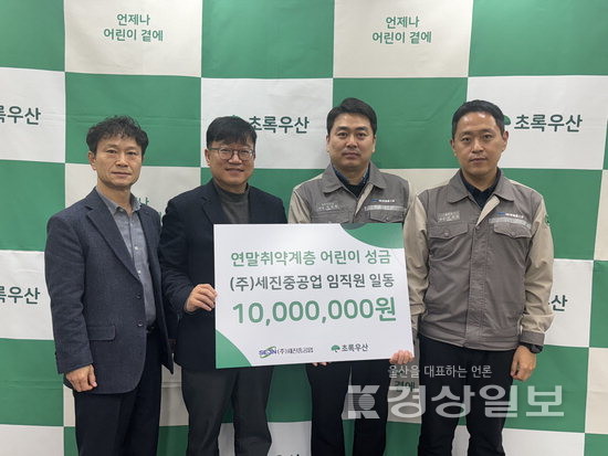 (주)세진중공업(대표이사 최양환)이 23일 취약계층 어린이를 위한 성금 1000만원을 초록우산 어린이재단 울산본부(본부장 김동환)에 전달했다. (주)세진중공업 임직원들이 정성을 모아 마련한 성금은 취약계층 지원사업에 사용될 예정이다. 권지혜기자 저작권자 © 울산일보 무단전재 및 재배포 금지 권지혜 기자 다른기사 보기 페이스북 트위터 카카오스토리 URL복사 기사공유하기