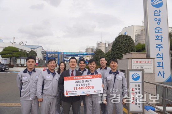 ▲ 울산사회복지공동모금회(회장 전영도)는 삼영순화 임직원들이 희망2026나눔캠페인에 동참해 성금 1144만원을 기부했다고 25일 밝혔다. 전중익 삼영순화 공장장은 “임직원 모두가 한마음으로 지역사회에 보탬이 되고자 기부에 참여했다”고 말했다.울산사회복지공동모금회(회장 전영도)는 삼영순화 임직원들이 희망2026나눔캠페인에 동참해 성금 1144만원을 기부했다고 25일 밝혔다. 전중익 삼영순화 공장장은 “임직원 모두가 한마음으로 지역사회에 보탬이 되고자 기부에 참여했다”고 말했다.