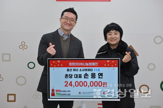 손응연 무거동 촌당 대표는 지난 24일 희망2026나눔캠페인 성금 2400만원을 울산사회복지공동모금회(회장 전영도)에 전달했다. 울산 아너소사이어티 21호 회원으로 최근 울산시민대상을 수상하기도 한 손응연 무거동 촌당 대표는 2016년부터 50차례 이상 울산의 소외된 이웃을 위해 꾸준히 성금을 기부해왔다.