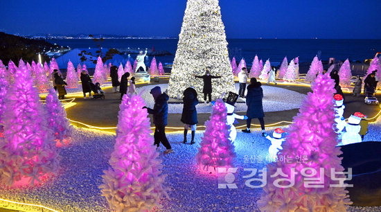 지난 26일 오후 9시께 울주군 서생면 대송리 산 108 일원. 영하의 날씨 속 뼈가 시릴 정도의 해풍이 불고 있음에도 수십 명의 방문객이 삼삼오오 무리를 이뤄 해변으로 향했다. 간절곶주차장에서 해변으로 향하다 보면 어두운 배경에 붉은 조명으로 이뤄진 숲과 노란빛 밀밭을 형상화한 전시물이 보인다. 방문객들은 대형 크리스마스트리와 조형물 사이에서 저마다 포즈를 취하며 사진을 찍었다.