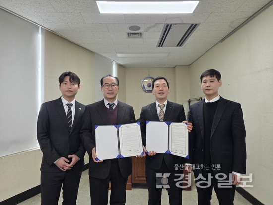 ▲ 법무법인 소울 울산분사무소와 울산시 재향경우회가 지난 26일 울산경찰청 경우회 사무실에서 상호 협력과 발전을 위한 법률자문 협약을 체결한 가운데 울산분사무소 공동대표 유리안·양남주 변호사, 울산시 재향경우회 오병국 회장과 김창호 사무처장 등이 기념촬영하고 있다.법무법인 소울 울산분사무소와 울산시 재향경우회가 지난 26일 울산경찰청 경우회 사무실에서 상호 협력과 발전을 위한 법률자문 협약을 체결한 가운데 울산분사무소 공동대표 유리안·양남주 변호사, 울산시 재향경우회 오병국 회장과 김창호 사무처장 등이 기념촬영하고 있다.