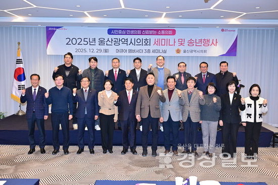 울산시의회(의장 이성룡)는 29일 울산 북구 머큐어앰배서더호텔에서 의원과 의회사무처 직원 등 100여명이 참여한 가운데 한 해 동안의 노고를 격려하고 상호 간 소통과 협력을 다지기 위한 ‘울산시의회 세미나 및 송년 행사’를 개최했다.