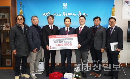 ▲ 김태연 한국정보통신공사협회 부산·울산·경남도회 회장 및 임원진들은 29일 울산시청 경제부시장실에서 안효대 울산시 경제부시장이 참석한 가운데 양호영 울산사회복지공동모금회 사무처장에게 연말 소외 이웃 생계비, 의료비 등 지원금 500만원을 기탁했다.김태연 한국정보통신공사협회 부산·울산·경남도회 회장 및 임원진들은 29일 울산시청 경제부시장실에서 안효대 울산시 경제부시장이 참석한 가운데 양호영 울산사회복지공동모금회 사무처장에게 연말 소외 이웃 생계비, 의료비 등 지원금 500만원을 기탁했다.