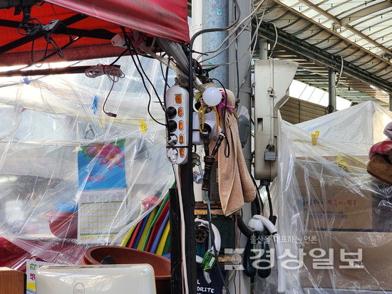 콘센트 하나에 난방기기와 조명 등이 동시에 연결된 이른바 ‘문어발식’ 전기 사용도 곳곳에서 확인됐다. 오래돼 피복이 벗겨진 전선들이 뒤엉켜 있었고, 전선 위에 수건 등을 걸어둔 점포도 있었다.