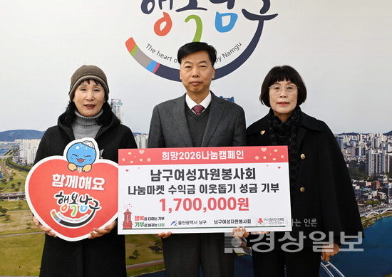 울산남구여성자원봉사회는 5일 남구청을 방문해 이웃돕기 성금 170만원을 울산사회복지공동모금회에 전달했다. 남구여성자원봉사회는 지난해 10월과 11월 아트온 페스티벌과 한마음 전진대회 등에서 사용하지 않는 물품을 기부받아 판매하는 나눔마켓을 운영했고 수익금을 전액 기부했다.