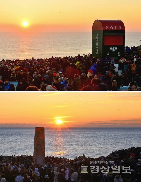 지난 1일 영하의 날씨 속에도 간절곶 해맞이공원에는 새해 첫 해를 보기 위해 울주군 추산 13만명의 인파가 몰렸다. 야간 경관인 ‘적설’과 각종 조형물 앞은 인증사진을 찍으려는 사람들로 붐볐다.