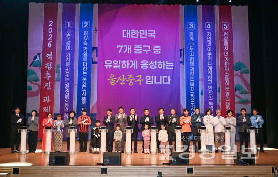 중구는 7일 중구문화의전당 함월홀에서 ‘2026년 신년인사회’를 개최했다. 김영길 중구청장과 박경흠 중구의회 의장, 김두겸 울산시장, 이성룡 울산시의회 의장, 박성민 국회의원, 시·구의원, 각급 기관·단체장, 지역 주민 등 500여명이 참석했다. 김영길 중구청장은 △도시성장 기반 확충 △주택재개발사업 지원 △상권·전통시장 활성화 △공영주차장 확충 △지속가능한 도시재생 추진 △재해 대응 체계 구축 △공공청사 환경개선 △돌봄통합지원 등 올해 주요 사업에 대해 설명했다. 이어 구정 비전 제시 퍼포먼스 순서에서는 행정과 주민이 함께 비전을 실현하자는 의미로 김영길 중구청장 및 주요 내빈들이 군인, 경찰, 소방관, 의사, 요리사, 노인, 청소년, 다문화 가족, 다둥이 가정 등 각계각층의 주민 대표와 함께 비전 선포 단추를 눌렀다.
