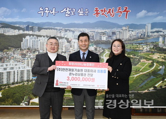 ▲ 안전제일기술원(대표이사 최종철)은 8일 울산 중구청을 방문해 김영길 중구청장에게 이웃돕기 온누리상품권 300만원을 전달했다. 온누리상품권은 저소득 계층 30명에게 각 10만원씩 전달될 예정이다.안전제일기술원(대표이사 최종철)은 8일 울산 중구청을 방문해 김영길 중구청장에게 이웃돕기 온누리상품권 300만원을 전달했다. 온누리상품권은 저소득 계층 30명에게 각 10만원씩 전달될 예정이다. 저작권자 © 울산일보 무단전재 및 재배포 금지 주하연 기자 다른기사 보기 페이스북 트위터 카카오스토리 URL복사 기사공유하기