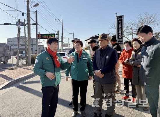 이와 관련해 지난해 8월에도 주민 제보로 현장 간담회가 열려, 당시 교차로의 구조적 특성과 과속 문제에 대한 점검이 이뤄진 바 있다. 이번 방문은 이후 상황을 다시 확인하고, 현장 여건을 바탕으로 사고 위험을 줄이기 위한 관리 방안을 함께 공유하기 위해 마련됐다. 이날 현장 점검에서는 차량 흐름과 신호 운영 상황, 운전자 시야 여건 등을 중심으로 의견을 나누고, 횡단보도 인접 보도 구간의 보도블록 포장 상태에 대한 주민 요청도 함께 전달됐다. 전상헌기자