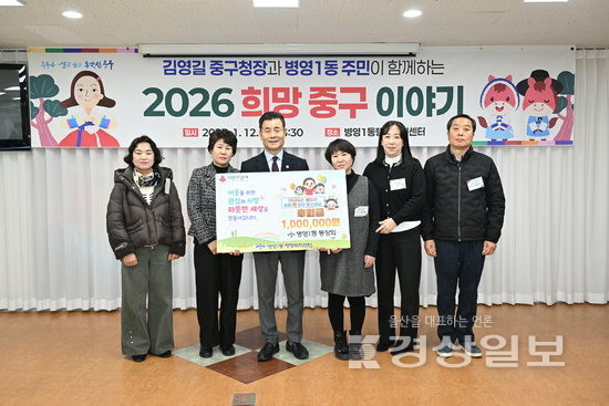 ▲ 울산 중구 병영1동 통장회(회장 손미숙)와 남윤경 그린리더 병영1동협의회 회장은 12일 병영1동 행정복지센터 프로그램실에서 열린 ‘구청장과 동 주민이 함께하는 2026 희망 중구 이야기’ 행사에서 병영1동에 이웃돕기 성금을 각각 100만원, 242만원씩 기부했다.울산 중구 병영1동 통장회(회장 손미숙)와 남윤경 그린리더 병영1동협의회 회장은 12일 병영1동 행정복지센터 프로그램실에서 열린 ‘구청장과 동 주민이 함께하는 2026 희망 중구 이야기’ 행사에서 병영1동에 이웃돕기 성금을 각각 100만원, 242만원씩 기부했다.