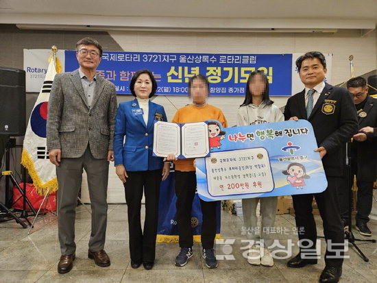 ▲ 국제로타리 제3721지구 울산상록수 로타리클럽(회장 박창욱)이 지난 12일 지역의 한 식당에서 중구 다운동 행정복지센터에 저소득가정 학생을 위한 장학금 200만원을 전달했다.국제로타리 제3721지구 울산상록수 로타리클럽(회장 박창욱)이 지난 12일 지역의 한 식당에서 중구 다운동 행정복지센터에 저소득가정 학생을 위한 장학금 200만원을 전달했다. 저작권자 © 울산일보 무단전재 및 재배포 금지 주하연 기자 다른기사 보기 페이스북 트위터 카카오스토리 URL복사 기사공유하기
