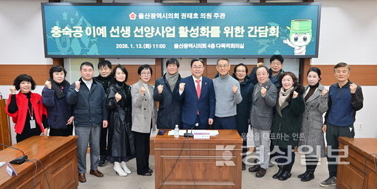 울산시의회 권태호 산업건설부위원장은 13일 시의회 4층 다목적회의실에서 동절기 비회기 일일근무의 일환으로 이예 선생 선양사업 확산을 위해 구성된 가칭 ‘이예위원회’ 회원 등이 참석한 가운데 ‘충숙공 이예 선생 선양사업 활성화를 위한 간담회’(사진)를 열었다.