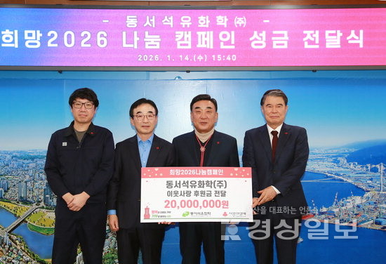 동서석유화학(주)는 14일 울산시청 접견실에서 김태오 동서석유화학 전무와 김두겸 울산시장, 전영도 울산사회복지공동모금회장 등이 참석한 가운데 이웃돕기 성금 전달식을 열었다. 동서석유화학은 이날 ‘희망2026나눔캠페인’의 일환으로 성금 2000만원을 기탁했다. 성금은 지역 내 저소득 가구와 복지관, 주변의 도움이 필요한 아동 등에게 지원된다. 동서석유화학은 지난해에도 지역사회를 위해 2000만원을 기부하는 등 해마다 따뜻한 나눔을 실천하고 있다. 이다예기자 ties@ksilbo.co.kr 저작권자 © 울산일보 무단전재 및 재배포 금지 이다예 기자 다른기사 보기 페이스북 트위터 카카오스토리 URL복사 기사공유하기