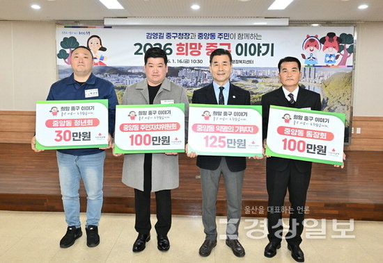 ▲ 울산 중구 중앙동 주민자치위원회(위원장 이대희)·통장회(회장 이영철)·청년회(회장 박근모), 익명의 주민이 지난 16일 중앙동 행정복지센터 민방위교육장에서 열린 ‘구청장과 동 주민이 함께하는 2026 희망 중구 이야기’ 행사에서 중앙동에 이웃돕기 성금 각 100만원, 100만원, 30만원, 125만원을 기부했다.