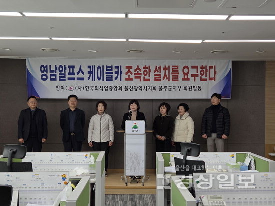 (사)외식업중앙회 울산시지회 울주군지부 회원 일동은 지난 16일 울주군청 프레스룸에서 기자회견을 열고 영남알프스 케이블카 환경영향평가 재검토 결정을 규탄하며 “영남알프스 케이블카 사업을 즉각 승인하고, 관광 활성화를 통한 실질적인 지역 경제 살리기 대책을 마련하라”고 촉구했다. 신동섭기자