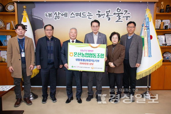 ▲ 온산농업협동조합(조합장 신문철)이 19일 군청 소회의실에서 이순걸 군수와 신문철 온산농협 조합장, 손영순 울주푸드뱅크마켓 센터장 등이 참석한 가운데 울주푸드뱅크마켓에 200만원 상당의 생활용품(화장지)를 전달했다.온산농업협동조합(조합장 신문철)이 19일 군청 소회의실에서 이순걸 군수와 신문철 온산농협 조합장, 손영순 울주푸드뱅크마켓 센터장 등이 참석한 가운데 울주푸드뱅크마켓에 200만원 상당의 생활용품(화장지)를 전달했다.