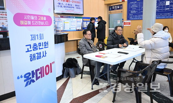 20일 울산대공원에서 아쿠아시스에서 2026년 제1회 ‘찾아가는 고충민원해결사 왔데이’가 실시된 가운데 울산시민고충처리위원과조사관들이 현장에서 시민들의 고충을 상담하고 있다. 김동수기자 dskim@ksilbo.co.kr