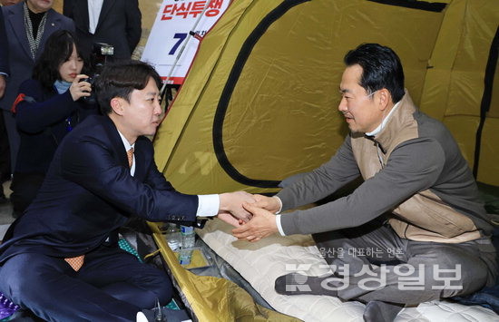 이날 새벽 귀국한 이 대표는 국회 로텐더홀 농성장을 찾아 “양당 공조를 강화하려면 대표님이 지휘관으로서 역할을 해주셔야 한다. 지금 대표님의 결기를 믿지 못하는 사람이 어디 있느냐. 건강 먼저 챙기시라”고 했다.