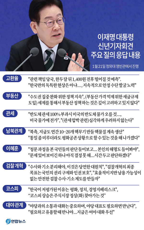 21일 청와대 영빈관에서 열린 이재명 대통령의 신년 기자회견은 무려 3시간 가까이(173분) 펼쳐졌다.