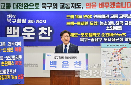 백 북구청장 출마 예정자는 22일 울산시의회 프레스센터에서 기자회견을 열고 “트램 2호선을 경주 버스가 실제 연결되는 시 경계까지 단 1㎞ 연장해 북구를 ‘환동해권 교통의 관문’으로 경주~포항~경산을 잇는 교통의 심장이 되게 할 것”이라고 강조했다. 이어 “농소3동과 천곡 지역 교통 문제 해결을 위해 버스 노선 개편에 이어 ‘트램-트레인’ 시스템을 도입하겠다”고 약속했다. 또 “이예로~오토밸리로~강동을 잇는 순환 교통망의 기틀을 완성하고, 이예로와 오토밸리로를 순환하는 ‘직결 순환버스’를 도입하겠다”고 말했다. 전상헌기자