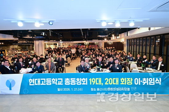 ▲ 현대고등학교 총동창회는 지난 21일 중구 남외동 울산시티컨벤션 벨라지오홀에서 내빈과 졸업생 등 150여명이 참석한 가운데, 정기총회 및 제19·20대 회장 이·취임식을 개최했다. 이날 정종관 회장(3회)이 이임하고 김인석 회장(1회)이 새로 취임했다.현대고등학교 총동창회는 지난 21일 중구 남외동 울산시티컨벤션 벨라지오홀에서 내빈과 졸업생 등 150여명이 참석한 가운데, 정기총회 및 제19·20대 회장 이·취임식을 개최했다. 이날 정종관 회장(3회)이 이임하고 김인석 회장(1회)이 새로 취임했다.