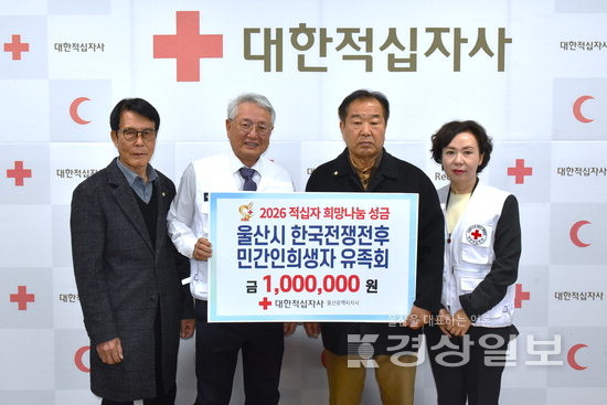 ▲ 울산시 한국전쟁전후민간인희생자 유족회(회장 이상윤)는 26일 대한적십자사 울산지사에 적십자 희망나눔성금 100만원을 전달하며 이웃사랑을 위한 나눔 운동에 동참했다.울산시 한국전쟁전후민간인희생자 유족회(회장 이상윤)는 26일 대한적십자사 울산지사에 적십자 희망나눔성금 100만원을 전달하며 이웃사랑을 위한 나눔 운동에 동참했다. 저작권자 © 울산일보 무단전재 및 재배포 금지 정혜윤 기자 다른기사 보기 페이스북 트위터 카카오스토리 URL복사 기사공유하기