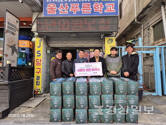 ▲ 울산시소상공인연합회(회장 김창욱)는 26일 중구 성인문해 교육기관인 ‘울산푸른학교’를 방문해 라면 84박스를 전달했다. 사랑의 라면 기부는 소상공인들이 어려운 여건에서도 취약계층을 돌보는 사회공헌활동 차원에서 이뤄졌다.울산시소상공인연합회(회장 김창욱)는 26일 중구 성인문해 교육기관인 ‘울산푸른학교’를 방문해 라면 84박스를 전달했다. 사랑의 라면 기부는 소상공인들이 어려운 여건에서도 취약계층을 돌보는 사회공헌활동 차원에서 이뤄졌다.
