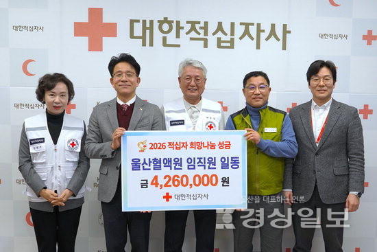▲ 대한적십자사 울산혈액원(원장 최인규) 임직원 일동은 27일 지역사회 내 어려운 이웃에 온정을 전하기 위해 대한적십자사 울산지사에 적십자 희망나눔성금 426만원을 전달했다. 전달식에는 최인규 대한적십자사 울산혈액원 원장, 백동찬 총무팀장, 김종호 노조지부장, 채종성 대한적십자사 울산지사 회장 등이 참석했다.대한적십자사 울산혈액원(원장 최인규) 임직원 일동은 27일 지역사회 내 어려운 이웃에 온정을 전하기 위해 대한적십자사 울산지사에 적십자 희망나눔성금 426만원을 전달했다. 전달식에는 최인규 대한적십자사 울산혈액원 원장, 백동찬 총무팀장, 김종호 노조지부장, 채종성 대한적십자사 울산지사 회장 등이 참석했다.
